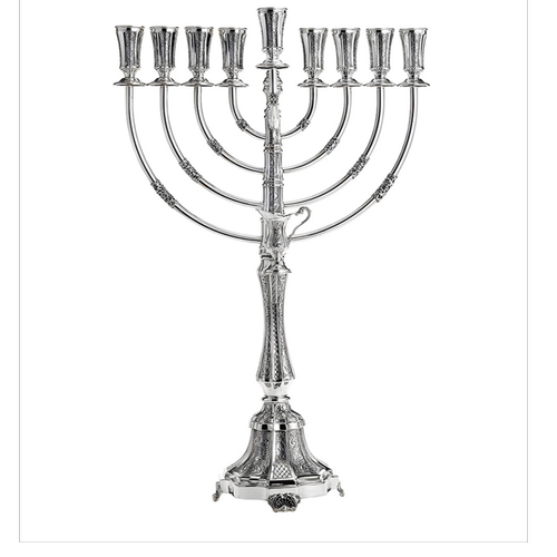 חנוכייה כסף טהור + כד שמן דגם איטליה מעוטרת. בגודל L. גובה: 63 ס"מ. משקל: 1335 גרם. מתאים להדלקת נרות שמן.