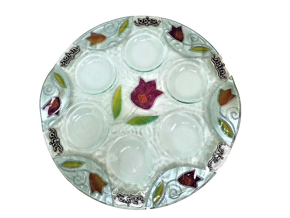 קערת ליל הסדר עיטור פרחי טוליפ מהודרים לחג הפסח. עם כיתוב פלקט מהודר ליד כל שקע: זרוע, ביצה, כרפס, חרוסת, מרור וחזרת. קיים במגוון צבעים. ובהדפס רימונים