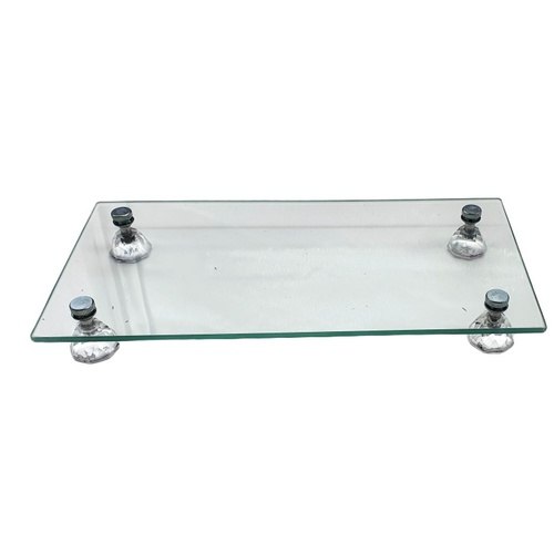מגש זכוכית עם רגליות. מתאים לכל מטרה כגון הדלקת נרות שבת, מגש חלה פרוסה, מגש עוגה ועוד. בגודל: 23X13 ס"מ