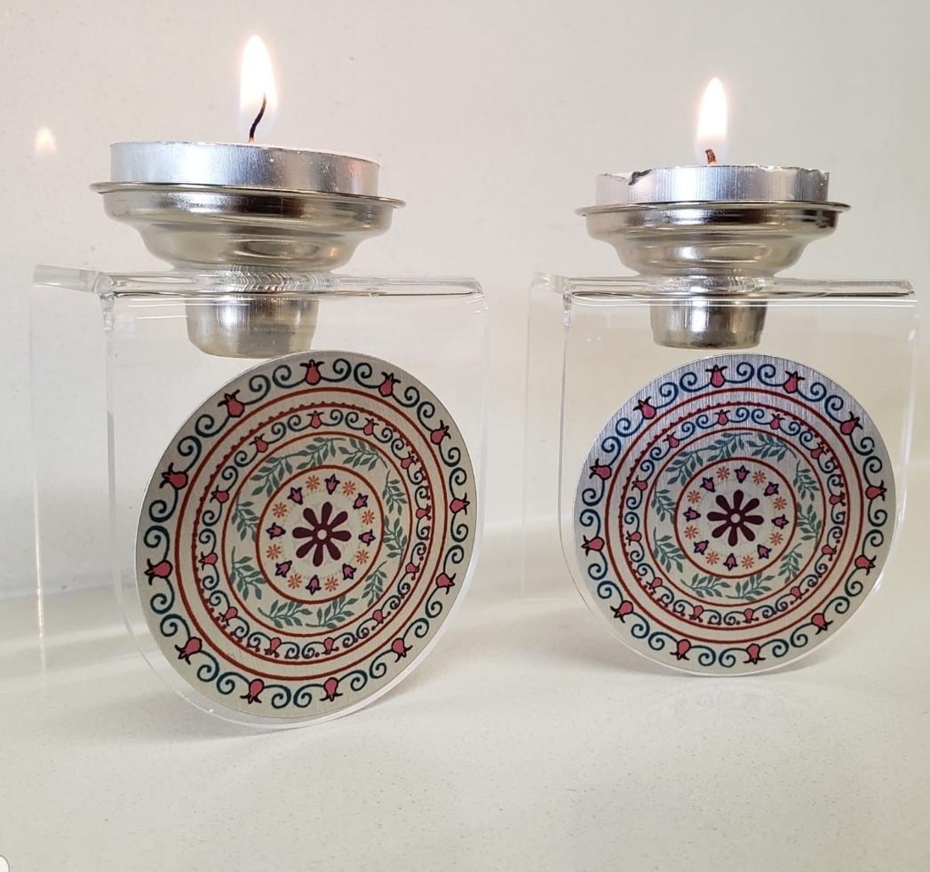 פמוטים לשבת מפרספקס עם פלקטה מעוצבת. קיים ב3 דגמים לבחירה.